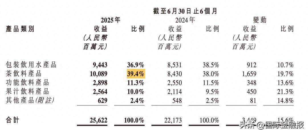今年上半年该板块实现营收100.89亿元,同比增长19.7%,营收占比由去年同期的38%提升至39.4%。但需要注意的是,与2023年和2024年同期59%以上的增速相比,今年茶饮料板块增速显著放缓。